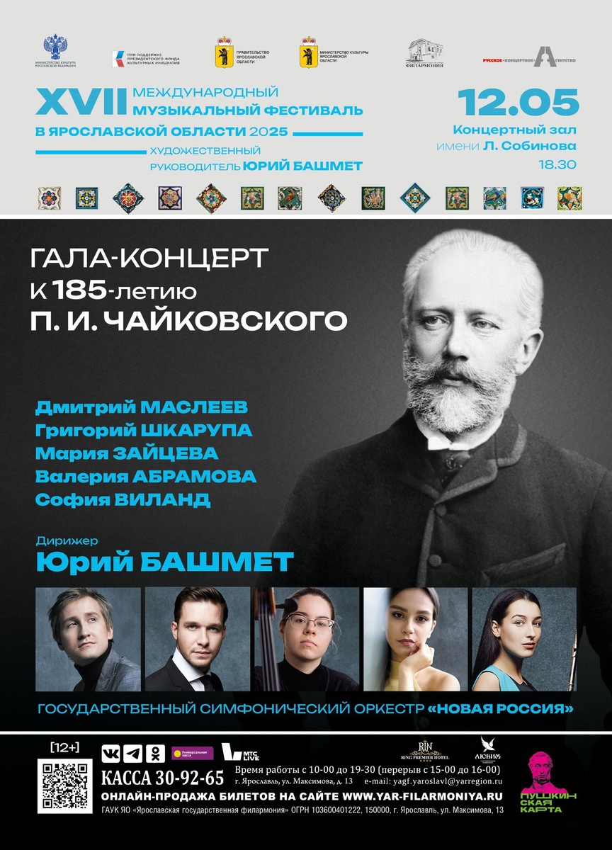 12 мая 2025 г. в 18:30 в Ярославской государственной филармонии в рамках XVII Международного музыкального фестиваля Юрия Башмета состоится Гала-концерт, посвящённый 185-летию со дня рождения П.И. Чайковского. https://clck.ru/3LMXgb