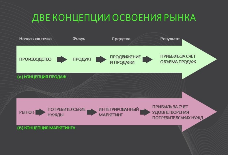 Или почему во многих компаниях не приживается "клиентоцентричность" Здесь и там, в ряду ключевых ценностей и маркетинговых стратегий, в последнее время стали встречаться «клиентоориентированность» или «клиентоцентричность». В интернете появились сотни статей о том как их внедрить, и почему без них теперь никуда. Никто не знает, кто и когда сделал это «открытие» и первый произнес эти слова, но, честно говоря, весь этот «хайп» вызывает искреннее недоумение. Еще 30 лет назад, на курсе по бренд менеджменту, профессор Института Управления (расположенного в Лозанне), рассказывал нам о двух подходах к освоению рынка — концепции продаж и концепции маркетинга: Концепция продаж фокусируется на нуждах продавца/производителя; формирует стоимость по принципу: продукт + затраты на продвижение; цель — максимизация прибыли за счет объема продаж. Концепция маркетинга — подход, сосредоточенный на потребностях покупателя. Он заключается в создании ценности для потребителя, относительно величины или
