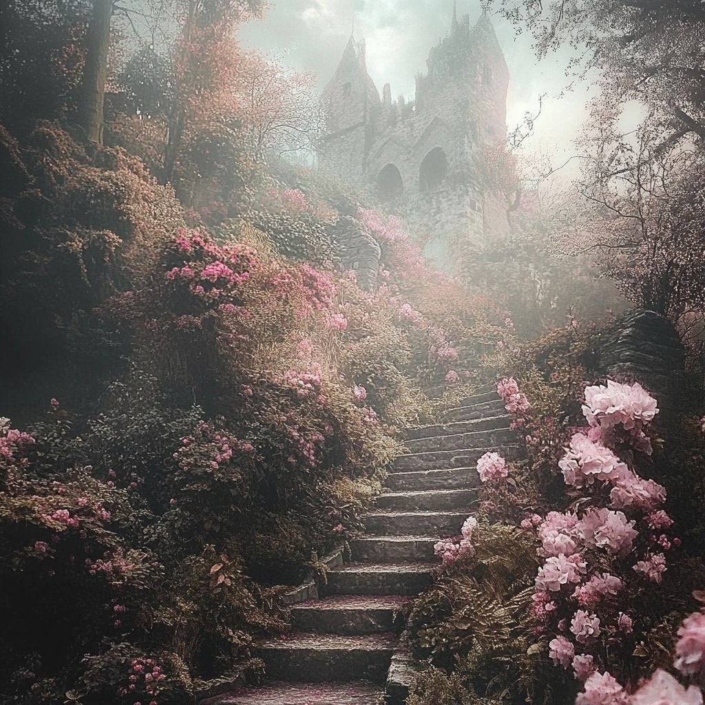 Создано на основе запроса: Romantasy Aesthetic - dreamy foggy forest, castles, dark florals, sword on velvet