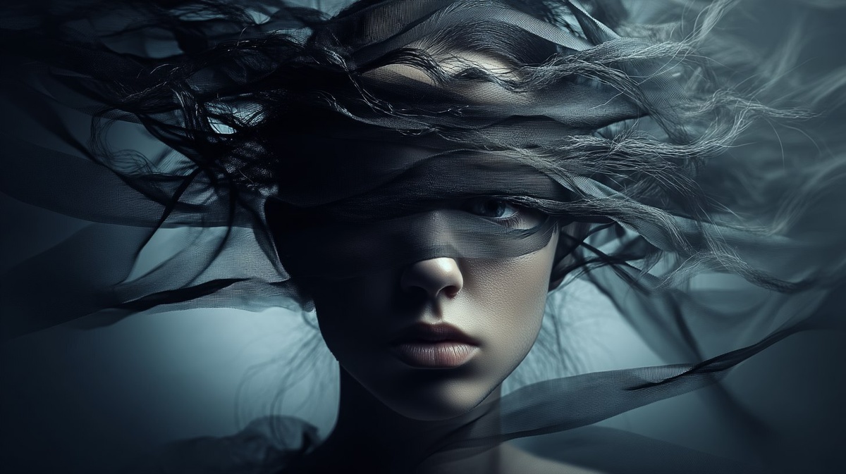 Создано на основе запроса: photo realistic woman with face covered with flowing misty fabric strips, cinematic lighting, photorealistic