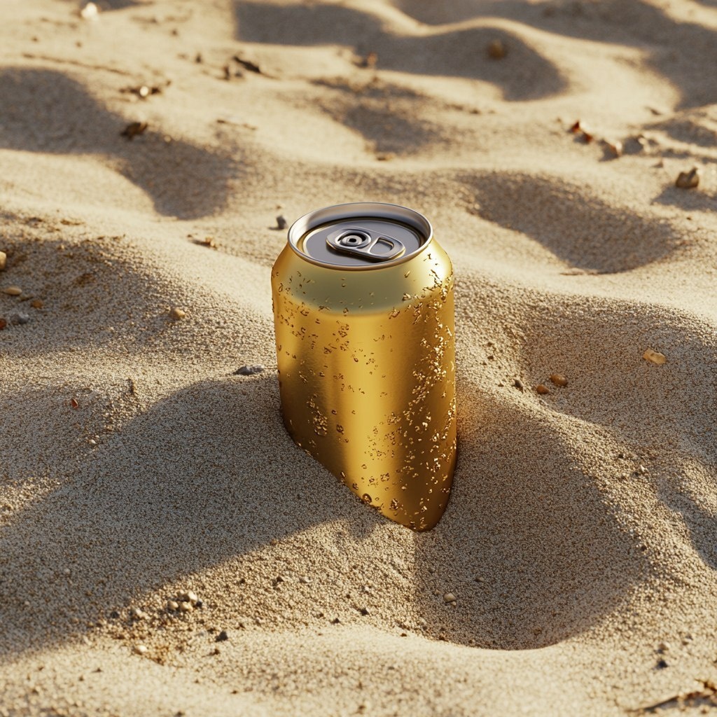 Создано на основе запроса: A gold can of beer color partially buried in smooth soft sand at the beach the camera is angled slightly