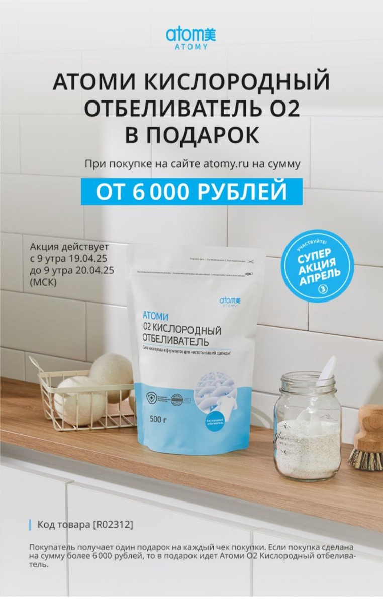 Атоми Кислородный отбеливатель О2 (500г) Атоми Кислородный Отбеливатель — мощное отбеливание и удаление пятен! Кислород и 5 ферментов для безупречной чистоты. Безопасный состав, сертификат DermaTest. Эффективная стирка для белого и цветного! Цена участника — 600,00₽ Чтобы покупать товары Атоми,, обращайтесь ко мне, я предоставлю доступ в личный кабинет АТОМИ.