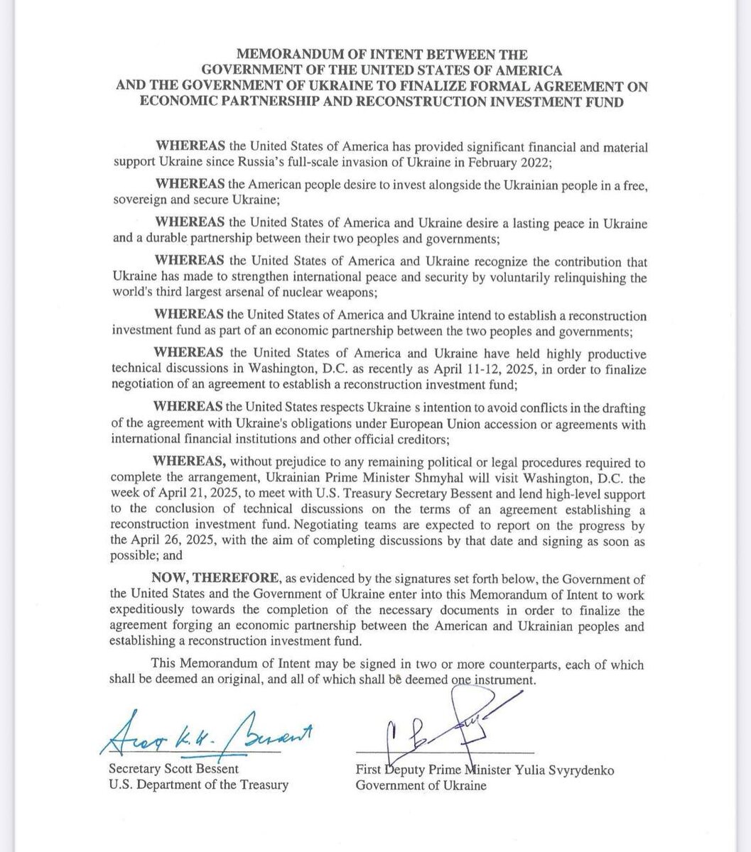 Вчера министр финансов США Скотт Бессент и первый вице-премьер Украины Юлия Свириденко подписали Меморандум о намерениях о создании Фонда восстановления Украины. Сам Меморандум — пустая бумажка ни о чем. Можно только отметить, что Украина явно внесла в него свои пожелания по поводу отдельных формулировок. В частности, там говорится о «полномасштабном вторжении России в Украину в феврале 2022», об избежании конфликта с обязательствами Украины перед ЕС при подписании соглашения и т. п. Но все написано ради одного: намерения к 26 апреля (субботе) завершить все дискуссии и подготовить соглашение к подписанию как можно быстрее. Что же это за соглашение? Согласно утечке в FT и Bloomberg в конце марта первая американская версия была абсолютно беспардонна и одиозна: 🔤Сделка распространяется на ВСЕ украинские природные ресурсы, в том числе нефть и газ, и инфраструктуру, связанную с эксплуатацией ископаемых (дороги, железные дороги, трубопроводы, порты и перерабатывающие заводы), энергетические