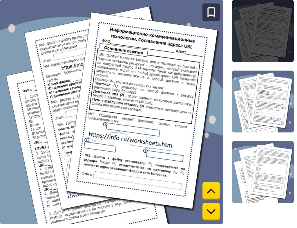 Эти рабочие листы (Теория: 2 листа - 6 заданий и Практика: 2 проверочных варианта по 9 заданий) составлены таким образом, что предназначены для отработки навыков Составление адреса URL. Рабочие листы структурированы таким образом, чтобы наглядно представить теоретический материал по данной теме, а также способствовать лучшему пониманию учащимися таких понятий как протокол, сервер, имя файла.