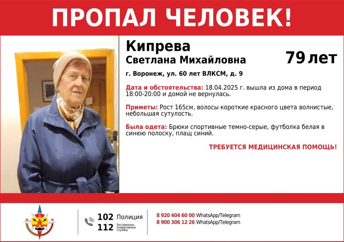 #пкпсцрегион36 #Кипрева ВНИМАНИЕ! ПРОПАЛ ЧЕЛОВЕК 79 лет! Кипрева Светлана Михайловна г. Воронеж, ул. 60-летия ВЛКСМ, д. 9 ‼️❗️НУЖДАЕТСЯ В МЕДИЦИНСКОЙ ПОМОЩИ ❗️‼️ Просим поделиться информацией, ваш репост поможет в поиске. Всем кому известна любая информация обращаться по телефонам 102, 112 или 8 920 404 60 00, 8 900 306 12 26