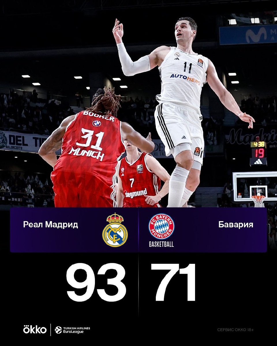 Баскетбольный «Реал» — не футбольный. Мадридцы крупно обыграли «Баварию» в плей-ин Евролиги и вышли в плей-офф 👑 Лучшим в составе хозяев стал Марио Хезонья, набравший 19 очков и совершивший 7 подборов 👏🏻