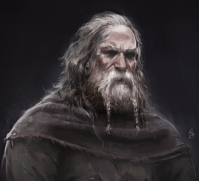 Он был в серой льняной рубашке, с длинными, ниспадающими локонами седых волос, толстыми усами и бородой, заплетённой в косы и огромным шрамом на переносице. Своей комплекцией старик давал фору культуристам в его облике и манерах сквозила звериная расслабленность и небрежность.
