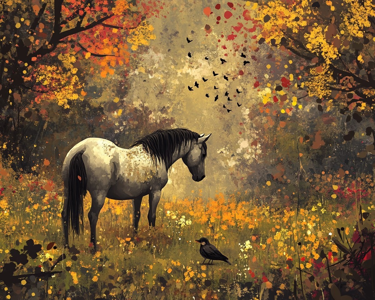 Создано на основе запроса: artwork of a horse in a pasture spring/summer time