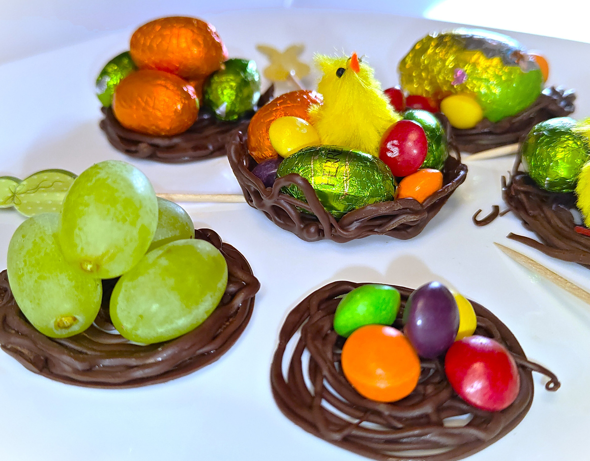Эти гнёзда — не только симпатичные, но и невероятно простые в исполнении. Справятся даже дети. В моем новом видео на YouTube (ссылку найдёте внизу) я поделилась всеми секретами, как за несколько минут превратить обычный шоколад в эти яркие сладости. Для этого понадобится шоколад, лёд, немного воды и, конечно, несколько украшений на ваше усмотрение (драже, виноград, ягоды, шоколадные яйца). Все эти ингредиенты легко найти в любом магазине, и они обойдутся вам совсем недорого.