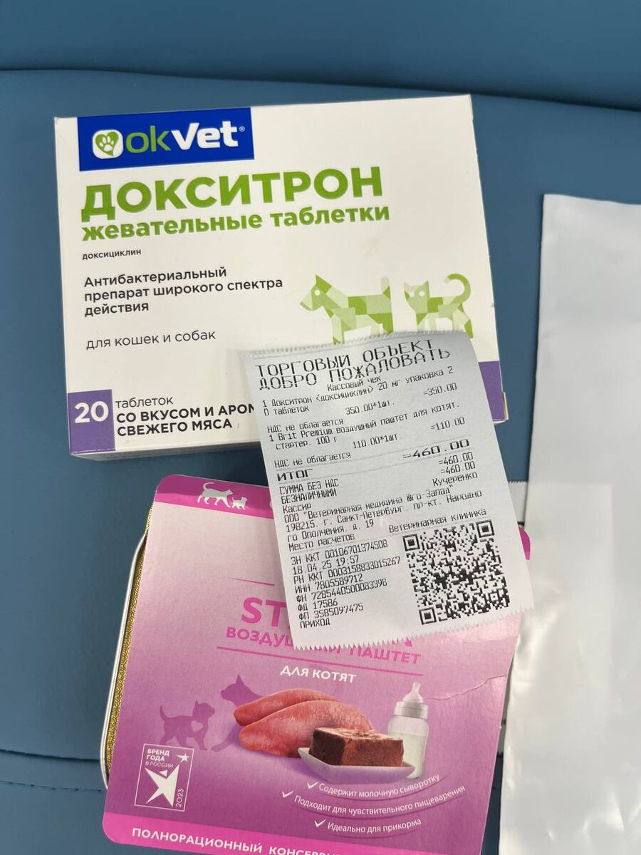 Забрала малявку, купила ей антибиотик и паштетик, покормлю перед дорогой