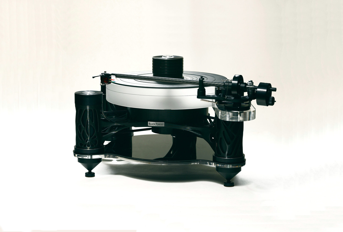 NewArtVinyl проигрыватель «Black Forest» напечатанный на 3D принтере. Студия NewArtVinyl пополнила свой каталог новым проигрывателем «Чёрный Лес». «Black Forest» это новое технологическое решение в конструировании виниловых проигрывателей. «Black Forest» имеет двухсоставную сложную структуру сочетающую напечатанную на 3D принтере пластиковую бионическую форму и внутренний вантовый скелет из стали и алюминия. Две части проигрывателя независимы друг от друга и в тоже время неразрывно связаны, что способствует быстрому затуханию резонансов и лучшему демпфированию. Вантовые конструкции представляют собой систему горизонтальных и вертикальных элементов, которые взаимодействуют друг с другом, чтобы обеспечить необходимую прочность и устойчивость, что позволяет им выдерживать большие нагрузки. Вантовый скелет проигрывателя состоит из тяжёлого стального диска с фрезерованными технологическими отверстиями под ванты , алюминиевого диска, трёх алюминиевых опорных стоек и шести алюминиевых вант