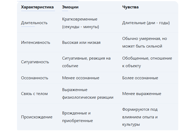 Эмоции и чувства – это субъективные переживания, отражающие отношение человека к себе, другим людям, объектам и событиям окружающего мира. Они играют важную роль в регуляции поведения, мотивации и адаптации к окружающей среде. Несмотря на тесную взаимосвязь, эмоции и чувства – не одно и то же. 1. Эмоции: 2. Чувства: 3. Отличия между эмоциями и чувствами (в таблице): 4. Взаимосвязь эмоций и чувств: Эмоции и чувства тесно связаны и взаимовлияют друг на друга. Эмоции могут быть компонентами чувств (например, чувство любви может включать в себя эмоции радости, нежности, восхищения). Чувства, в свою очередь, могут влиять на возникновение и проявление эмоций (например, чувство страха может приводить к возникновению эмоции тревоги). Эмоции часто являются “кирпичиками”, из которых формируются более сложные и устойчивые чувства. Повторяющиеся и закрепляющиеся эмоциональные переживания в отношении определенного объекта или человека формируют устойчивое чувство. 5. Классификации эмоций и чувств: