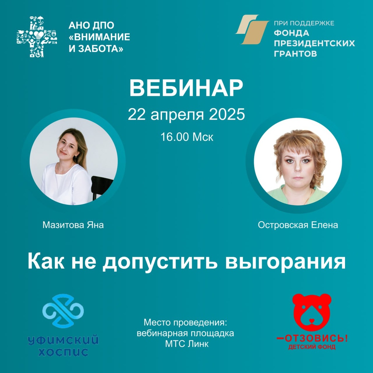 Дорогие друзья! АНО ДПО "Внимание и забота" в рамках проекта «Специалист по детству: уход и присмотр за детьми в особых состояниях и обстоятельствах» продолжает марафон вебинаров, посвященных актуальным темам ухода за людьми в особых состояниях и обстоятельствах. Вебинары проводят выпускники Школы - дипломированные преподаватели и специалисты по патронажному уходу. 📌Испытывали ли вы когда-нибудь эмоциональное опустошение? 📌Апатию или даже агрессию к своим коллегам или подопечным? 📌Вы чувствуете усталость не просто к концу рабочего дня, а уже с утра? Наверное, каждый из нас сталкивался с чем-то подобным в своей жизни. Поэтому, приглашаем вас на вебинар «Как не допустить выгорания», который состоится во вторник 22 апреля 2025 года в 16.00 по московскому времени. Место проведения: вебинарная площадка МТС Линк Проведут вебинар специалисты благотворительных фондов Мазитова Яна - тренер по уходу, координатор БФ "Уфимский хоспис" и БФ «Потерь нет» Островская Елена - тренер по уходу,