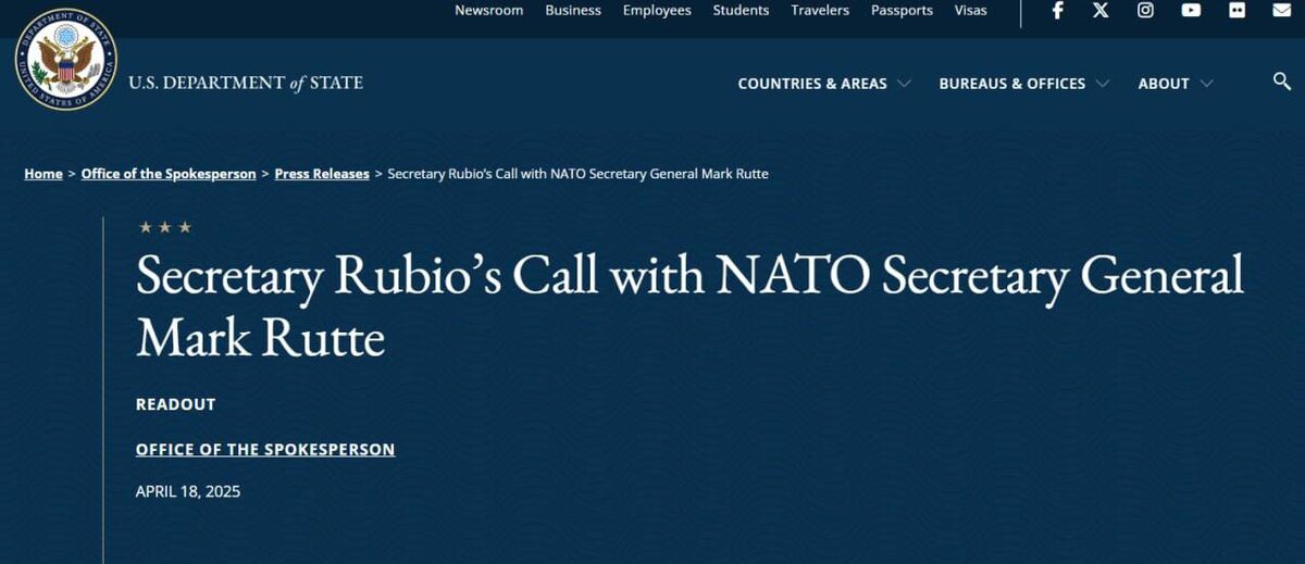 ⚠️ Госсекретарь США в разговоре с генсеком НАТО подтвердил, что если в ближайшее время не появится четкий путь к миру, США отойдут от своих