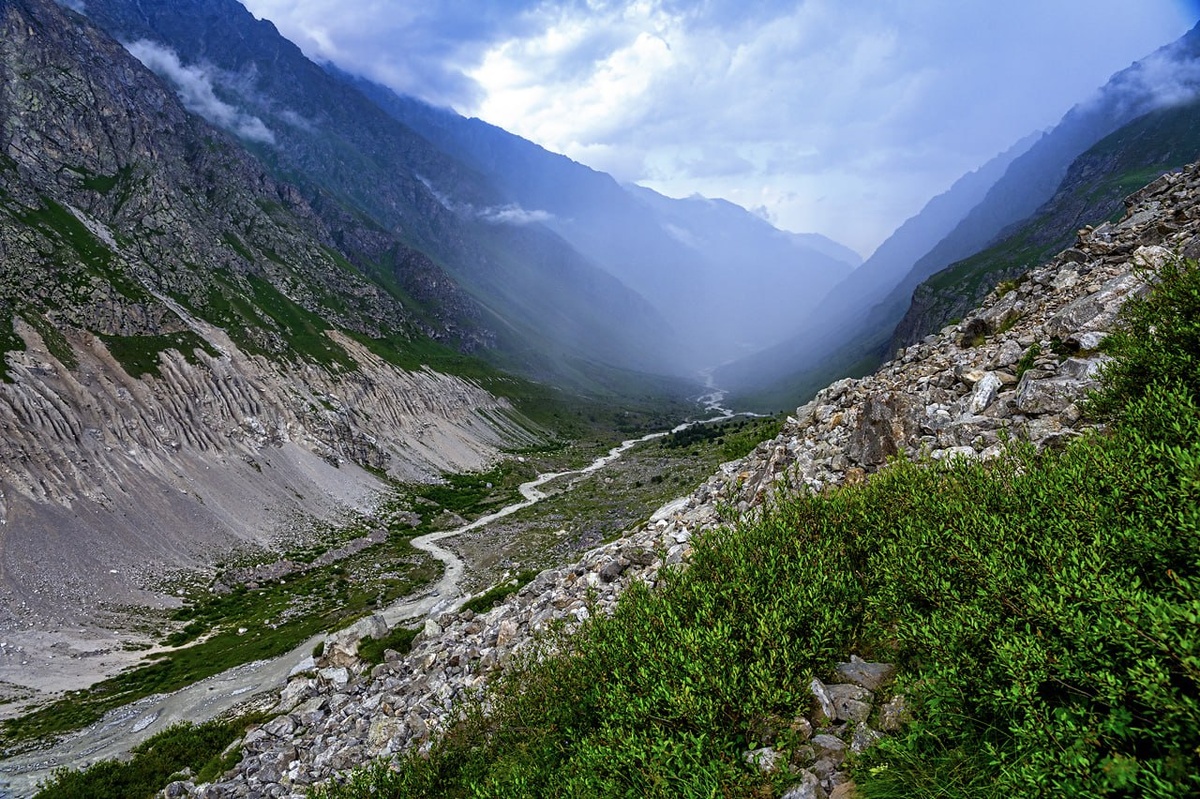 Надвигается дождь. Безенги, первый день в горах. Мы пошли прогуляться, и в пути я остановился сделать этот кадр. Ощущение красоты было сразу, а вот понимание того, что это стена дождя, и она движется на нас, несколько запоздало :) Состоялся внеплановый массовый забег вниз по тропе - не помогло. Прибежали мокрые насквозь, как будто в реке искупались. Хорошо, что я камеру с сумкой взял, у неё ещё чехол от дождя есть - очччень пригодился. Было и задорно, и весело. Пишу и улыбаюсь, вспоминая, как примчались в лагерь, редкие люди были в дождевиках и куртках, а мы ещё спрашивали, будучи мокрыми насквозь: а чего это вы в плащах? Дождь что ли собирается? Потом переоделись и отогревались чаем, а одежду высушило солнце завтрашнего дня. 15 лет прошло, а память и эмоции остались. Помню, как попадал под дождь в городах. Как-то ехал на велосипеде в ливень через половину Петербурга с аналогичным результатом - выжимать можно было всё, вплоть до белья. И самые яркие эмоции, конечно, от непогоды в горах
