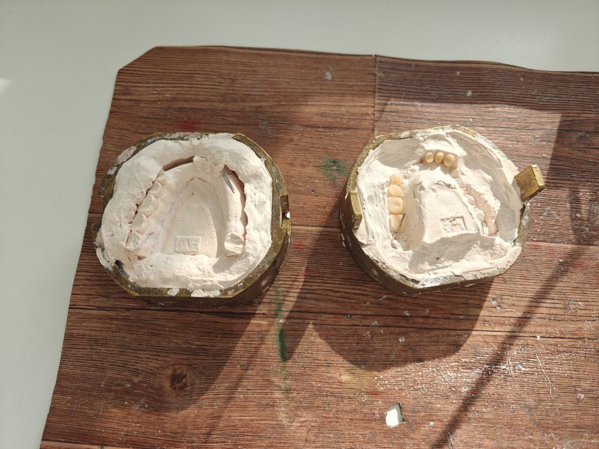 Всем привет. Сегодня расскажу этапы изготовления пластмассы, паковка и полимеризация частичного съемного протеза. После того как мы выварили отмоделированный базисный воск на будущем протезе (смотреть на картинке), нам нужно приготовить пластмассу для дальнейшей паковки и полимеризации. Для этого мы берем пластмассу Белакрил - М ГО (горячего отверждения) и начинаем замешивать ОБЯЗАТЕЛЬНО В СТЕКЛЯННОЙ ИЛИ ФАРФОРОВОЙ посуде (если замешать в пластмассовой посуде, то мономер просто разъест пластмассу). Замешиваем по соотношению - 1 гр порошка полимера на 1 зуб + 3 гр порошка на базис, мономера мы наливаем до насыщения и стадии мокрого песка. После того как мы замешали нашу пластмассу до стадии мокрого песка мы ждём, когда она созреет до стадии резиноподобной, при этом мы накрыли нашу стеклянную посуду крышкой, чтобы предотвратить улетучивание мономера. Также проверяем, созрела она или нет (берем кусочек и между пальцами протягиваем, если есть тянущиеся нити, то ещё не созрела). Главно