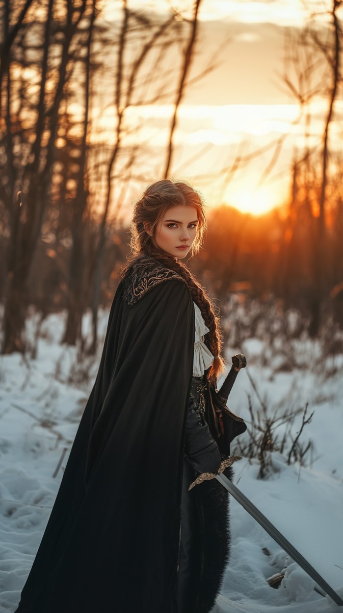 Создано на основе запроса: fantasy portrait of a 25-year-old girl against the background of a winter landscape and sunset, fantasy-style setting, illustrations, magical atmosphere. Light brown hair braided, bright brown eyes, dressed in a long black cloak with a fur cape, embroidery on the sleeves, white linen shirt, black trousers tucked into leather boots, sword in hand - mystical atmosphere, fantasy style --- Автоперевод: Фэнтезийный портрет 25-летней девочки на фоне зимнего пейзажа и заката, обстановки в стиле фэнтези, иллюстраций, волшебной атмосферы. Как тебе иллюстрация? 🤔 https://dzen.ru/id/65c0c65c86e4f837c27b24d7 #ИИ #AI #нейросеть #midjourney #art