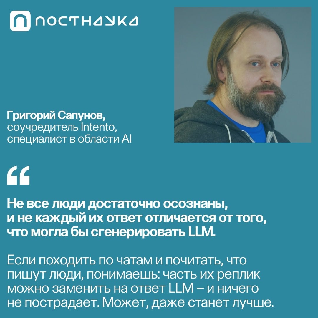 Кто-то боится, что боты станут слишком похожи на людей. Но внезапно оказалось, что некоторые люди — слишком похожи на ботов. Как LLM меняют представление о языке, общении и даже сознании — в разговоре с Григорием Сапуновым.