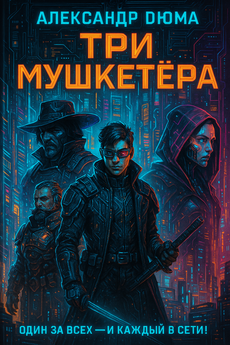 Если перенести героев Дюма в Киберпанк Вселенную «Три мушкетера» в стиле киберпанк: краткий обзор Год 2740. Мегаполис Нео-Париж. Искусственный интеллект-королева лишена доступа к своему основному ядру — загадочный вирус «Бэкингем» угрожает стабильности всей системы. Молодой хакер Д’Артаньян прибывает из провинциального сектора Гасконь, мечтая вступить в элитный отряд цифровых мушкетёров — кибер-рыцарей, защищающих корону от кибертеррористов и корпоративных заговоров. Там он встречает троих легендарных кибер-мушкетёров: Атос — мрачный воин с прошивкой старой эпохи и больным прошлым, Портос — любитель высоких ставок, улучшенных протезов и громких побед, Арамис — философ, хакер и святой в одном скафандре. Вместе они втягиваются в тёмную интригу, где главная антагонистка — Миледи, биоапгрейднутая шпионка с нейросетью на лице и дьявольским алгоритмом внутри. Их враг — кардинал Ришелье, главный архитектор корпоративной безопасности, мечтающий переписать кодекс власти. Слоган: Один за