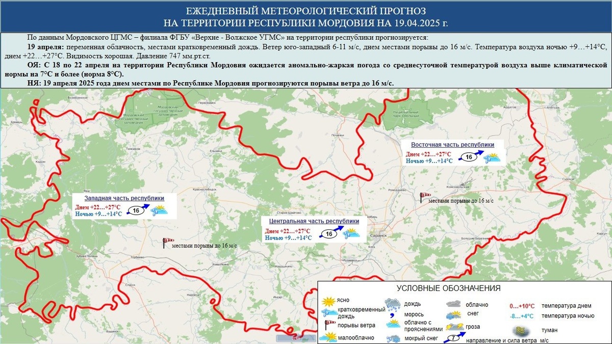 ☁️⛅⛈️ 19 апреля в Мордовии переменная облачность, местами кратковременный дождь. Ветер юго-западный 6-11 м/с, днем местами порывы до 16 м/с. Температура воздуха ночью +9…+14°С, днем +22…+27°С. Давление 747 мм рт. ст. Происшествия | Подписаться | Предложить новость