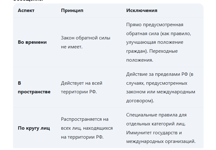 Действие гражданского законодательства во времени, в пространстве и по кругу лиц определяет сферу его применения и является важным для правильного толкования и применения норм гражданского права. I. Действие гражданского законодательства во времени: Основной принцип действия гражданского законодательства во времени - закон обратной силы не имеет (статья 4 Гражданского кодекса РФ). Это означает, что закон применяется к отношениям, возникшим после вступления его в силу. II. Действие гражданского законодательства в пространстве: Основной принцип действия гражданского законодательства в пространстве - гражданское законодательство РФ действует на всей территории Российской Федерации (статья 3 Гражданского кодекса РФ). III. Действие гражданского законодательства по кругу лиц: Основной принцип действия гражданского законодательства по кругу лиц - гражданское законодательство РФ распространяется на всех лиц, находящихся на территории Российской Федерации (статья 2 Гражданского кодекса РФ). Обо