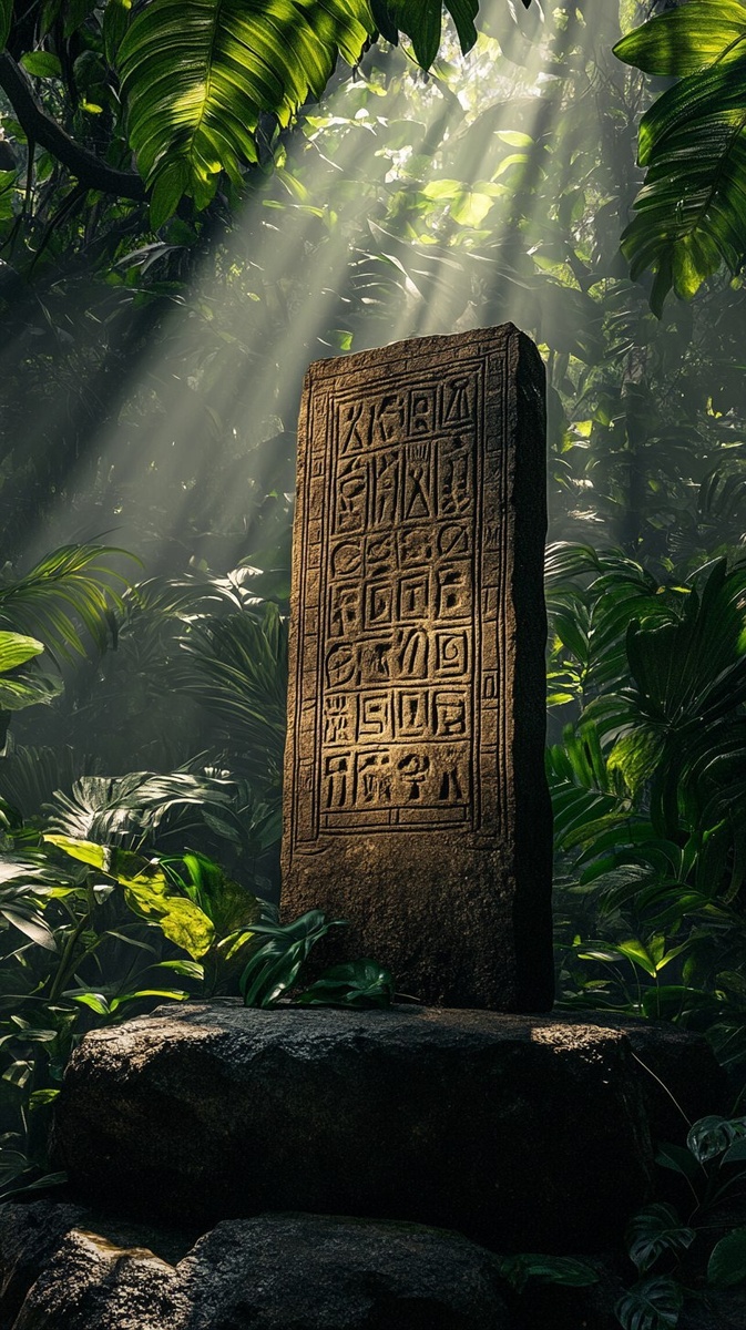 Создано на основе запроса: A weathered wooden tablet inscribed with the Rongorongo glyphs, placed on a stone altar amidst jungle foliage. Dappled sunlight filtering through leaves, creating intricate light patterns, 35mm lens, shot on Fujifilm X-T4, photorealistic, high detail,