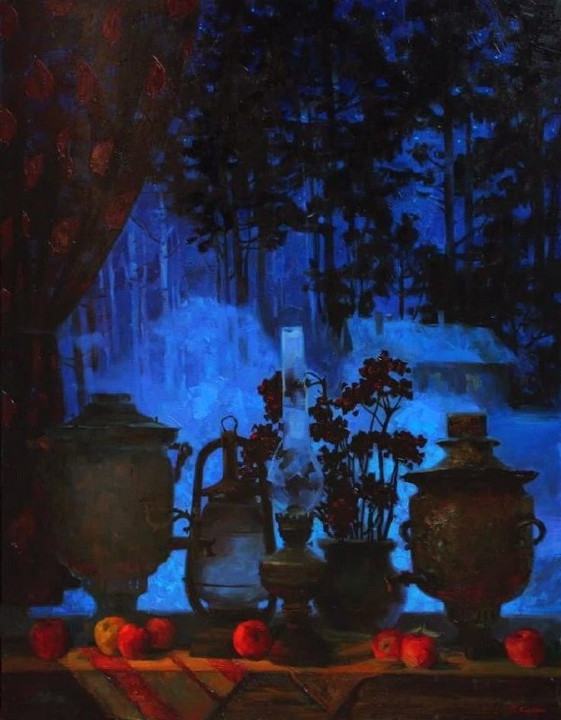 Колобова Маргарита, "Деревенская ночь". Есть прекрасная цитата моего любимого автора - "Когда слышишь стук копыт, меньше всего думаешь о зебре". Так при слове "самовар" в голове всегда яркий образ с бликами, блеском, цветными переливами. Но никак не силуэт в ночи. Так что задумка прекрасная. #живопись #художники