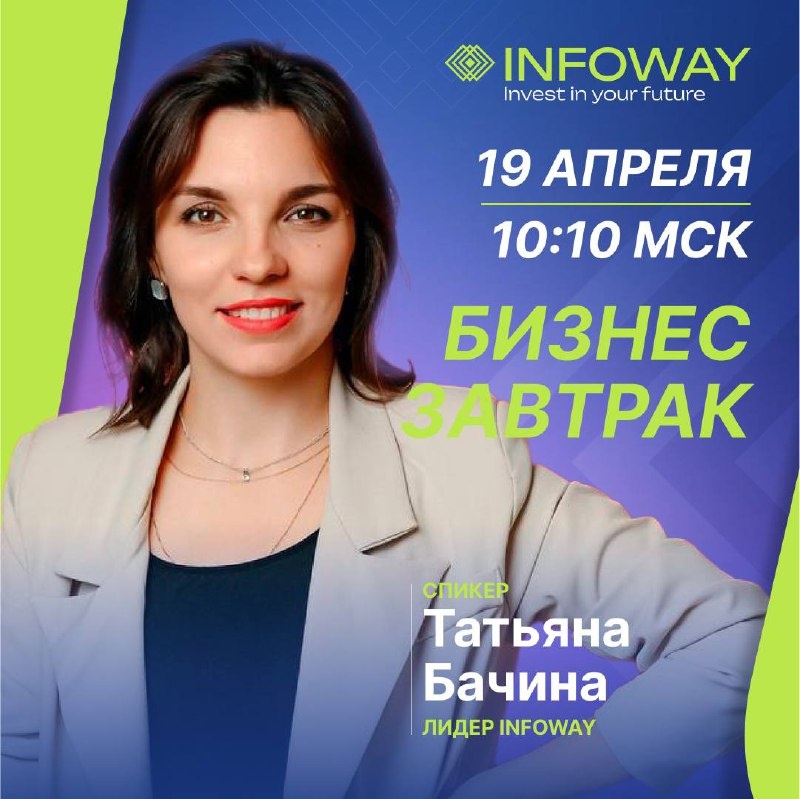 💡Приглашение на бизнес-завтрак с Татьяной Бачиной Дорогие друзья! Приглашаем вас на бизнес-завтрак с Татьяной Бачиной, который состоится 19 апреля (суббота) в 10:10 по московскому времени - здесь, на нашем официальном Telegram-канале! Этот бизнес-завтрак — отличная возможность начать свой выходной день с пользой, узнать новые фишки и стратегии для развития, а побыть в общем пространстве с единомышленниками из бизнес-комьюнити. Ждем вас 19 апреля в 10:10!
