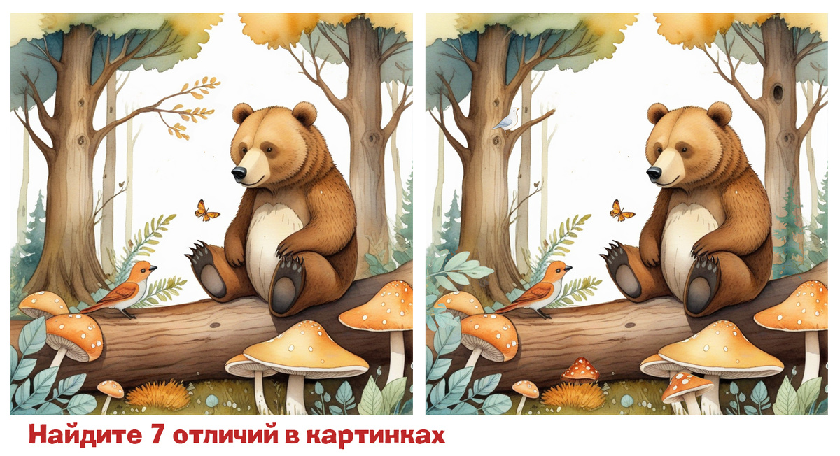 Как говорят грибники: "Только зоркий взгляд отличит съедобный гриб от ложного." В лесу, где деревья шепчутся с ветром, бурый медведь устроил себе уютное место на старом бревне. Птичка прилетела послушать его истории, а бабочка кружится, словно хочет присоединиться к беседе. Но что-то пошло не так… То ли гриб исчез, то ли листья перепутались? А может, медведь забыл, где оставил свою любимую ягоду? Найди 7 отличий и помоги лесу вернуть свою магию! Горизонтальная игра найди различия: Вертикальный тест на внимательность ответами: С таким зорким взглядом ты бы и в густом лесу не заблудилась! Пусть день будет таким же ясным, как твоя наблюдательность. До встречи!