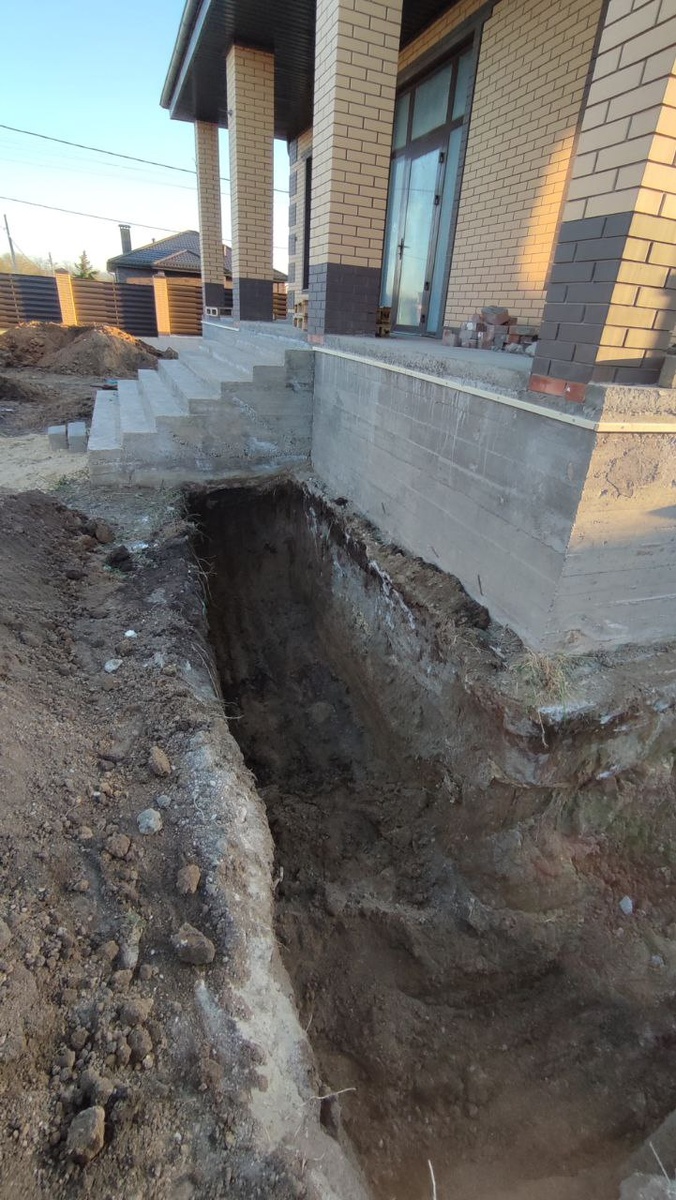 Откопали по кругу фундамент дома чтобы посмотреть состояние гидроизоляции и дренажной системы