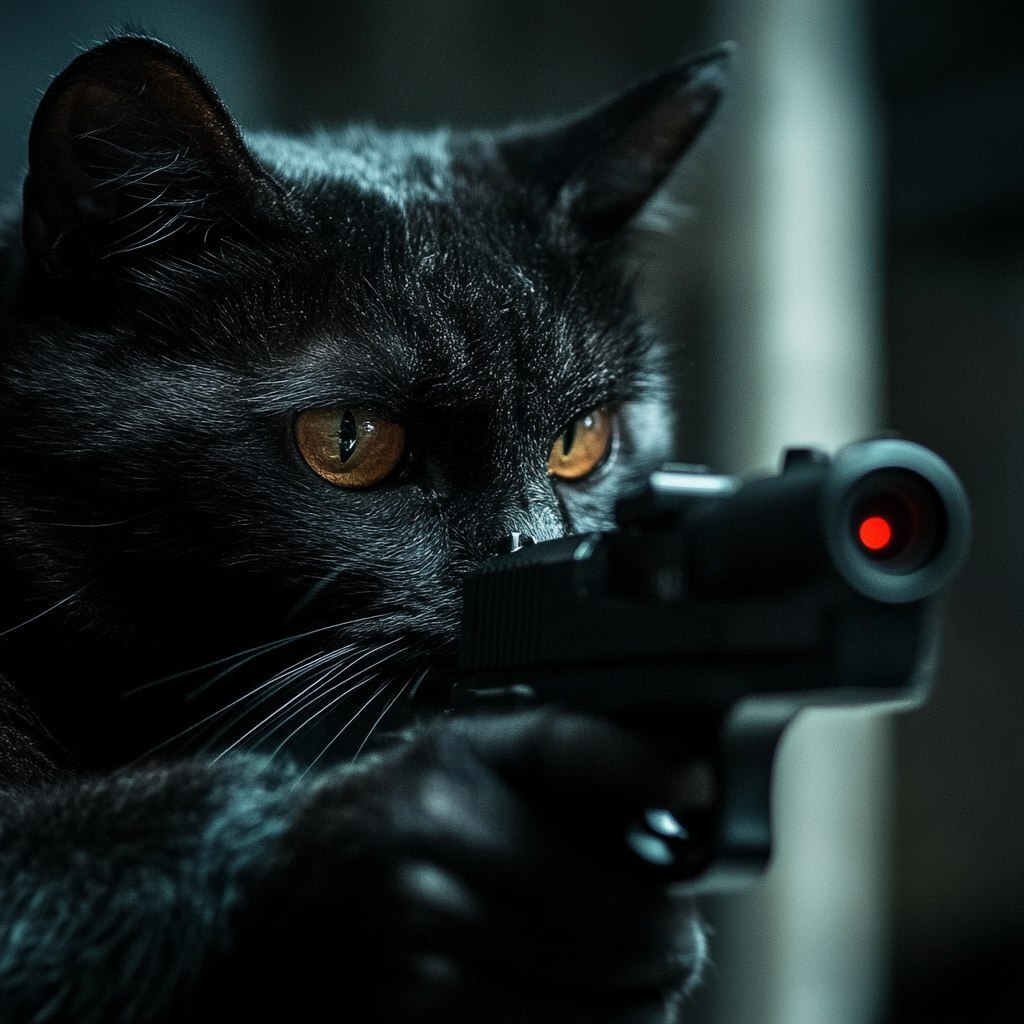 Создано на основе запроса: a black cat shooting a compensated pistol with a red dot scope