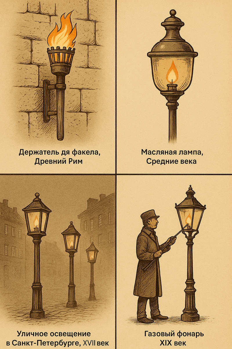 Сегодня мы воспринимаем уличное освещение как нечто само собой разумеющееся. Но когда-то улицы городов по вечерам погружались в полную темноту — и только с изобретением уличных фонарей ночная жизнь стала безопаснее и комфортнее. Первыми уличными “фонарями” были обычные факелы, зажжённые по вечерам. Их устанавливали в местах большого скопления людей — у дворцов, на рыночных площадях. Археологи находят такие держатели для факелов в античных городах, например, в Древнем Риме. Позднее, в Средние века, в европейских городах использовали масляные лампы. Горючее — в основном животные жиры или растительные масла — наливали в специальные сосуды, сверху вставляли фитиль. Но такие лампы давали мало света и быстро коптили. Первой официальной системой уличного освещения считается освещение Парижа в 1667 году по приказу короля Людовика XIV. Главный организатор — Габриэль Николас де Ла Рейни, глава парижской полиции. Он распорядился установить по городу фонари со свечами и масляными лампами, которые
