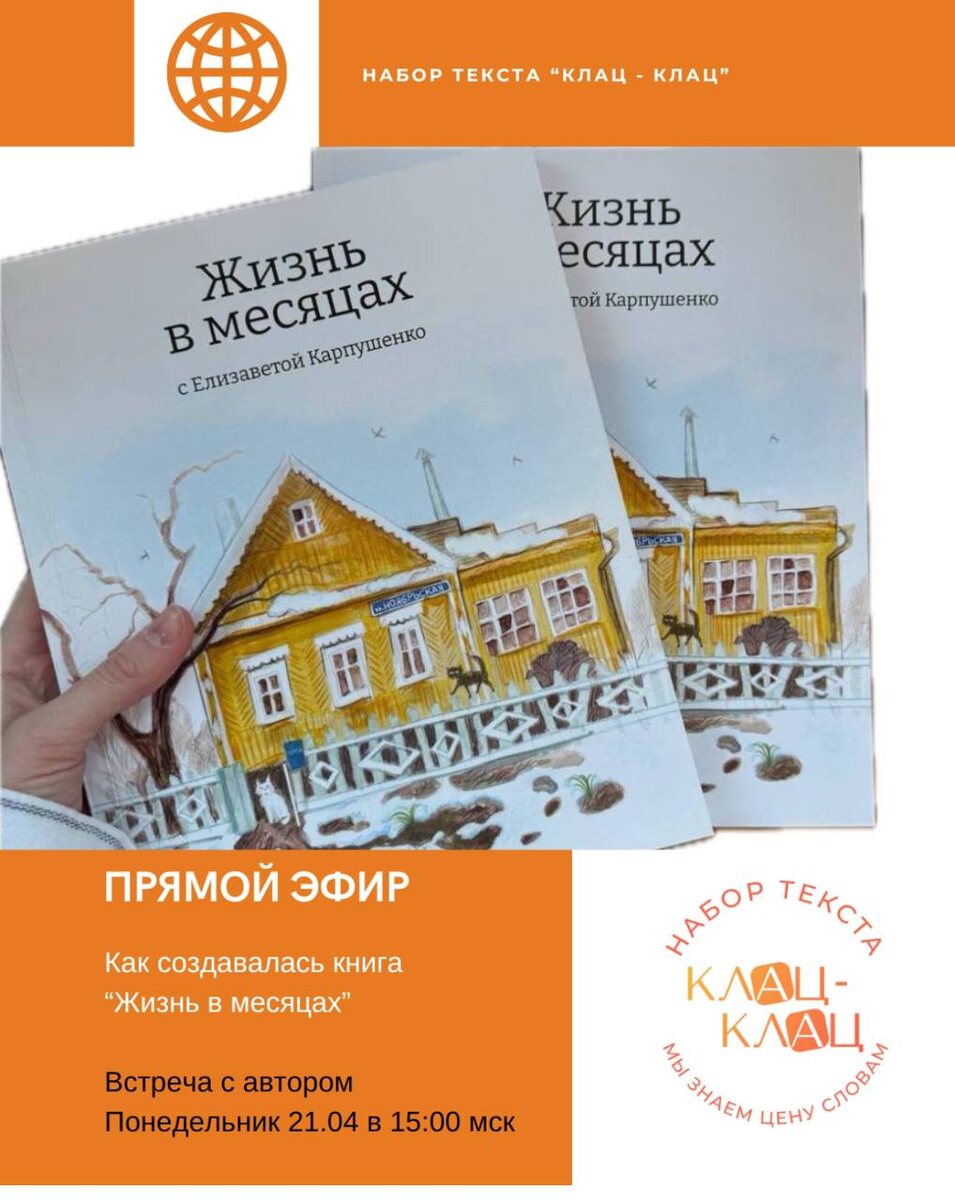 Приглашаем на прямой эфир с Елизаветой Карпушенко, автором прекрасной книги о России! В понедельник, 21 апреля, в 15:00 (мск) вы сможете лично познакомиться с Елизаветой и узнать историю создания уникального проекта «Жизнь в месяцах». Мы, Агентство «Клац-Клац», гордимся тем, что стали частью этого долгосрочного и наполненного любовью к нашей стране проекта. Елизавета, вооружившись фотоаппаратом, путешествовала по России, снимая самые трогательные моменты. 📸 Из этих поездок родилась книга о красоте, о широкой душе и простых сюжетах, о поводе остановиться и почувствовать жизнь во всей её полноте. Елизавета общалась с жителями разных регионов, собирая истории об их быте и отношении к родному краю. Нам, Агентству «Клац-Клац», автор доверила написать тексты, оформить фотографии, сделать дизайн и сверстать целое путешествие длиною в год! В прямом эфире мы раскроем секреты работы над проектом, поговорим о вдохновении, трудностях и о том, как создавалась эта удивительная книга. Не пропустите!