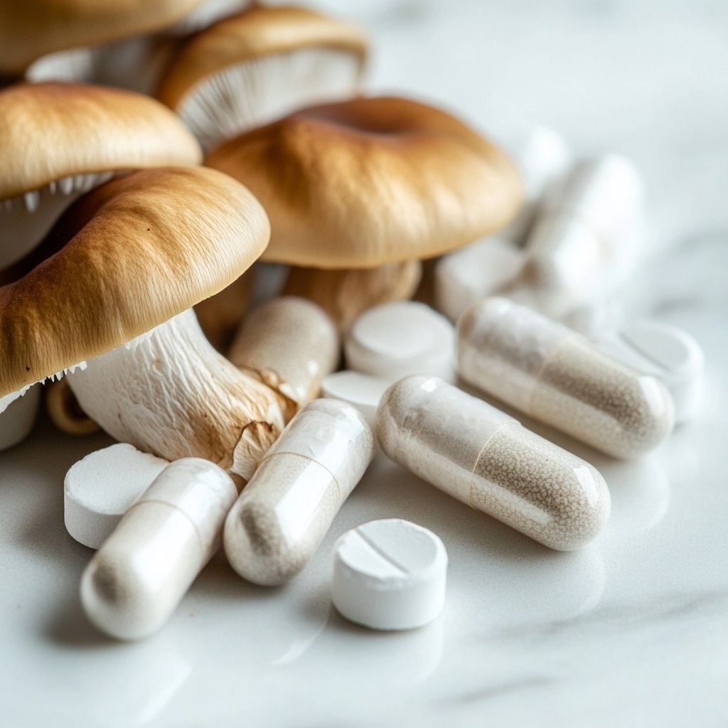 Создано на основе запроса: medicinal preparations from mushrooms, a tablet in a section where the composition of a mushroom tablet is