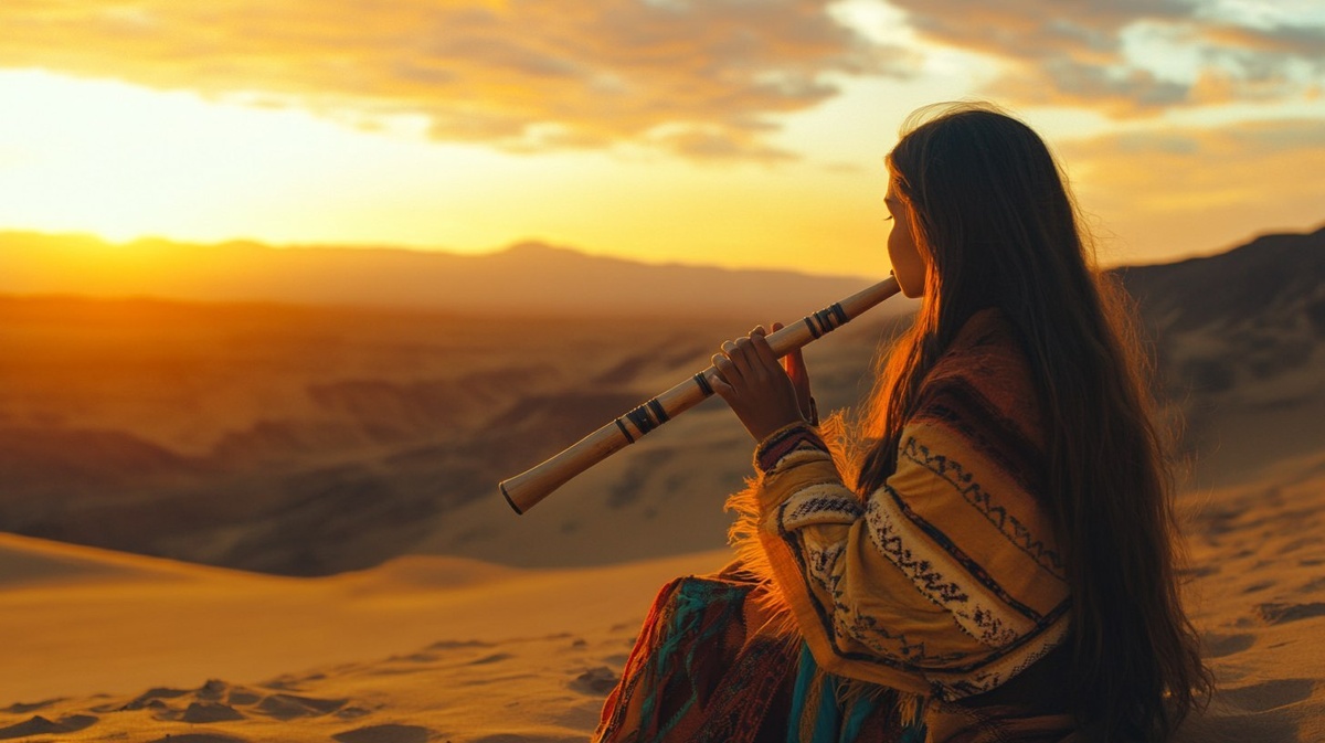Создано на основе запроса: A inka indigenous woman musician with a flute sorounded in the desert, cinematography by roger deakins