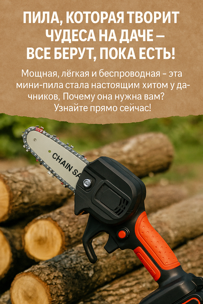Представьте: вы на даче. Надо порезать ветки, распилить бревно, подготовить дрова. Топор тупой, ножовка рвёт руки, а сил — как у телефона на 1%. Знакомо? Пора это менять. Встречайте инструмент, который уже называют “маленьким зверем” — аккумуляторную мини-пилу нового поколения. 1. Мощь, которую не ждёшь от такого малыша Несмотря на компактный размер, пила легко берёт деревяшки до 15 см в диаметре. Это не игрушка — это серьёзный помощник. 2. Свобода без розеток Работает на аккумуляторе — забудьте про провода, удлинители и вечную возню. Один заряд — и вы пилите хоть в лесу, хоть на пикнике. 3. Ультра-лёгкая и удобная Вес — всего ничего. Даже если вы не качок, рука не устанет. Можно работать часами, и всё под контролем. 4. Безопасность + простота Идеально для новичков. Никаких сложных кнопок или инструкций. Включил — и пошёл творить! “Бревно в 10 см пилит за пару секунд. На даче просто незаменима!” — Андрей, 46 лет “Я — женщина, и да, я сама теперь справляюсь с дровами. Пила просто супе