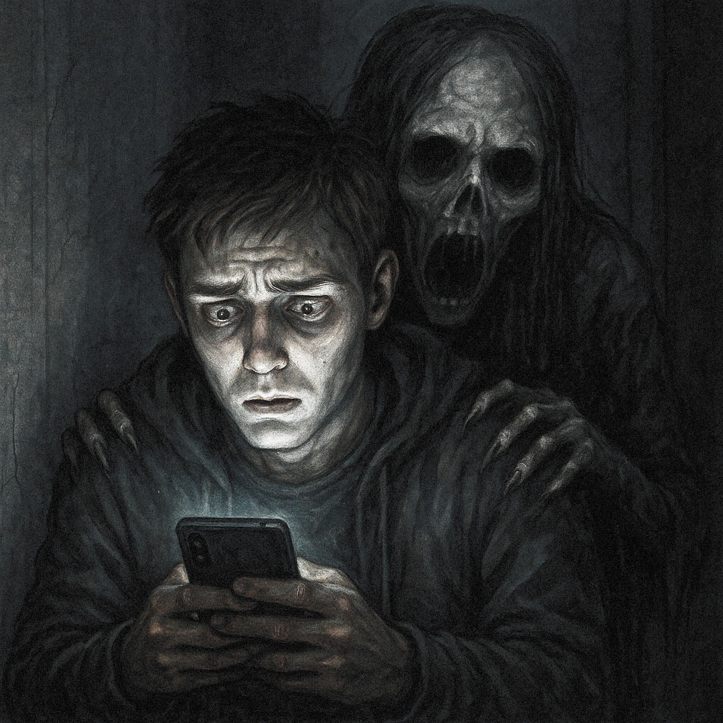 Он вскочил, отбросил телефон, оглянулся в панике. Комната была пуста. Но в воздухе повисло странное давление — ощущение, будто пространство сжалось, стало меньше, чем должно быть. Он чувствовал: в комнате кто-то есть.