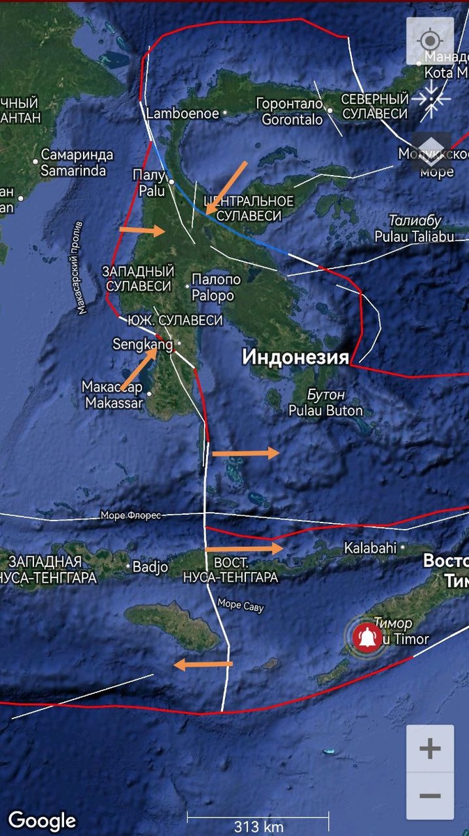 Бурная дегазация наблюдается в районе южного Сулавеси и вдоль разлома на юг в сторону моря Саву