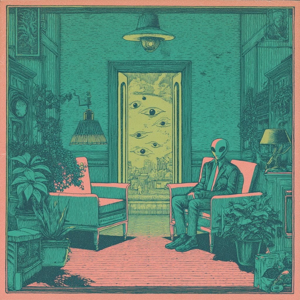Создано на основе запроса: iconography album covers of the 70s and 80s grotesque, Surreal and detailed illustrations of an alien character in room with two armchairs, one door, and three eyes looking at the viewer, sophisticated pastel color palette --- Автоперевод: Иконографические обложки альбома 70 -х и 80 -х годов гротескные, сюрреалистические и подробные иллюстрации инопланетного персонажа в комнате с двумя креслами, одной дверью и тремя глазами, глядя на зрителя, изысканная пастельная цветовая палитра Классно выглядит? 🤔 https://dzen.ru/id/65c0c65c86e4f837c27b24d7 #ИИ #AI #нейросеть #midjourney #art