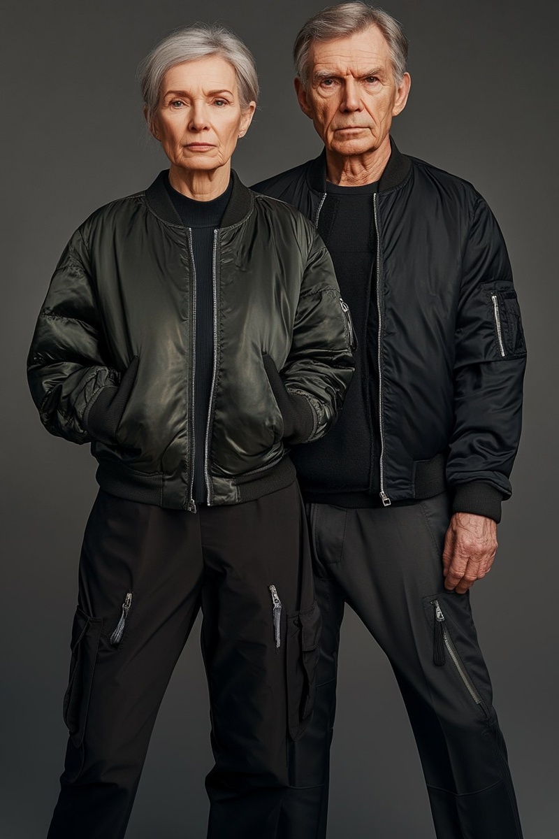 Создано на основе запроса: grandparents in bomber jackets. Sullen look of a model. Photo studio lighting. bomber --- Автоперевод: бабушка и дедушка в куртках бомбардировщика. Необычно получилось? 🤔 https://dzen.ru/id/65c0c65c86e4f837c27b24d7 #ИИ #AI #нейросеть #midjourney #art