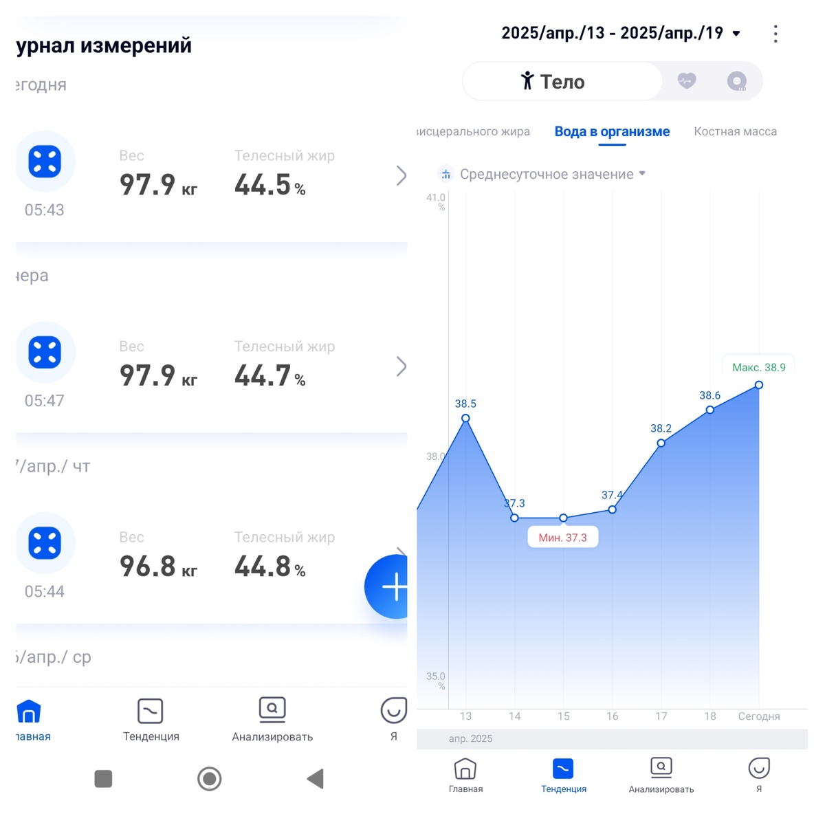 1. Вес. Сегодня без изменений, но всё же внутри тела процессы идут, жир снижается, вода скачет.