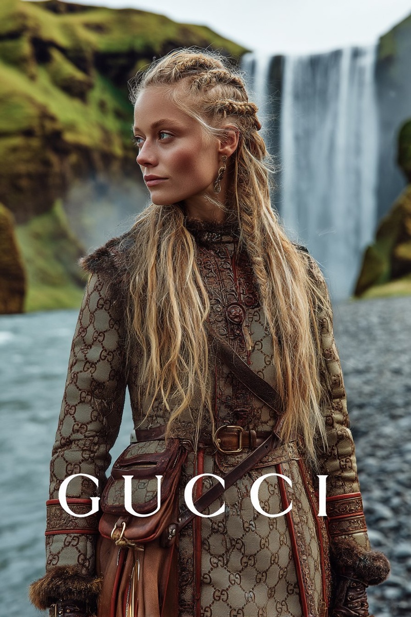 Создано на основе запроса: Photo of a viking woman in rural iceland, in the style of Gucci, featuring a Lagertha esque viking, she is