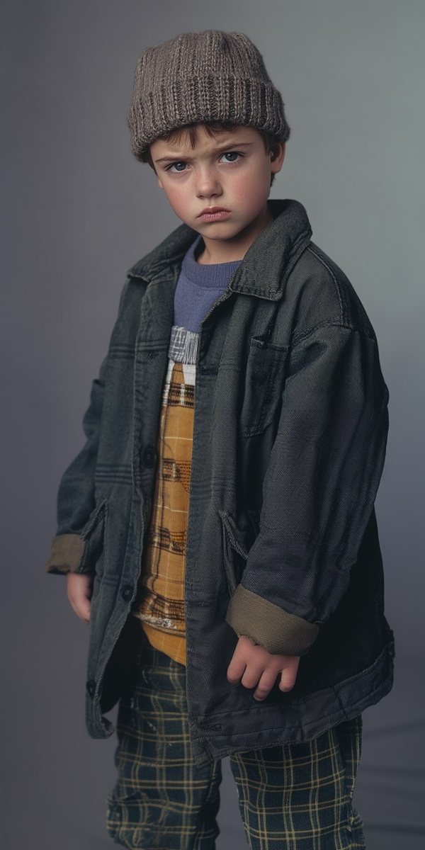 Создано на основе запроса: kids in a 90s fashion. Sullen look of a model. Photo studio lighting.