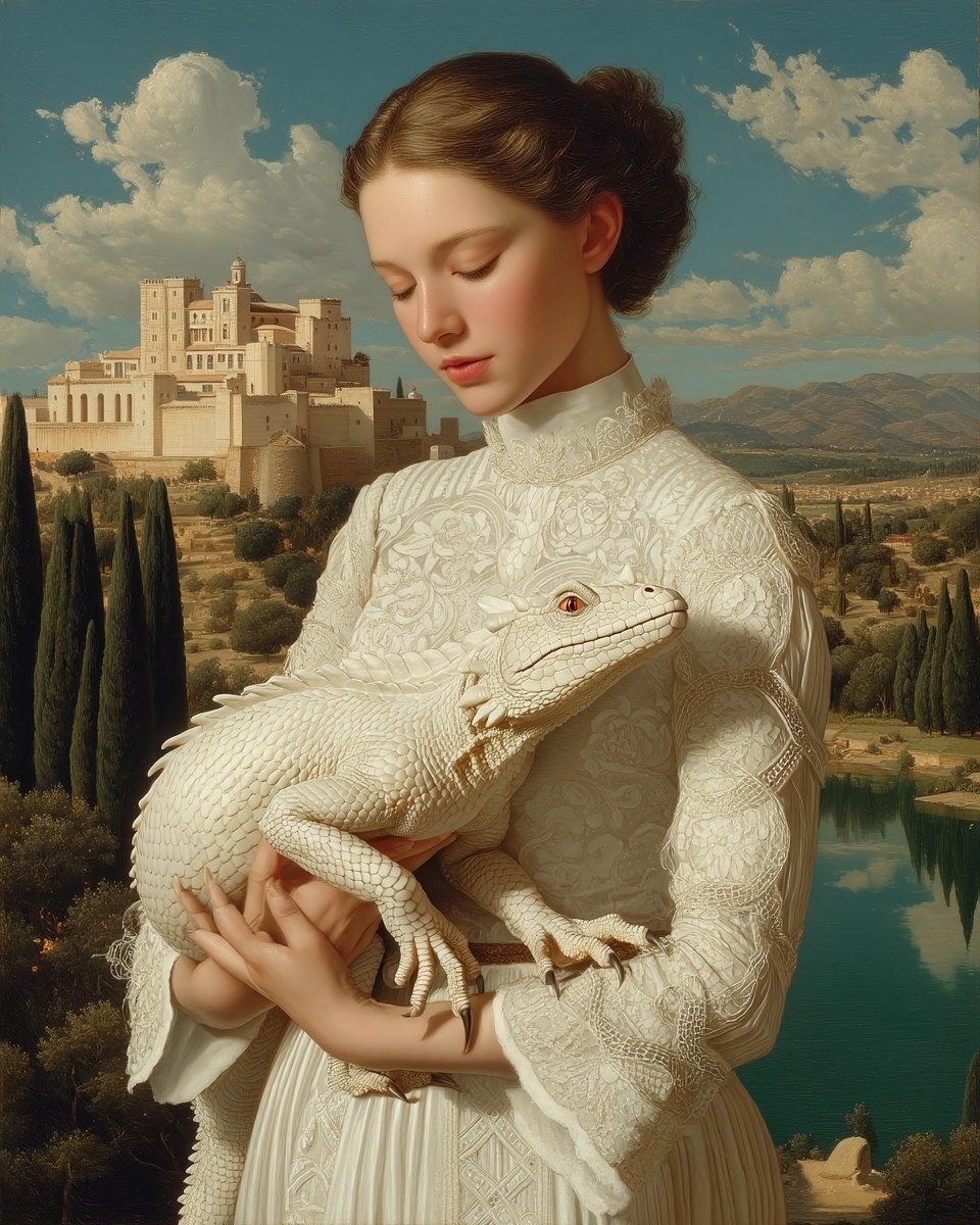 Создано на основе запроса: portrait of a woman in white lace dress, holding a big shining dragon, landscape of lake, blue sky, cypress trees afar, a florentine castle, extremely sharp intricate details in the face and dress, high resolution , oil painting in the style of Nicolas Poussin --- Автоперевод: Портрет женщины в белом кружевном платье, держащем большой сияющий дракон, пейзаж озера, голубое небо, кипарисовые деревья издалека, флорентийский замок, чрезвычайно острые детали на лице и платье, высокое разрешение, масляная живопись в стиле Николаса Пуссин Отлично вышло? 🤔 https://dzen.ru/id/65c0c65c86e4f837c27b24d7 #ИИ #AI #нейросеть #midjourney #art