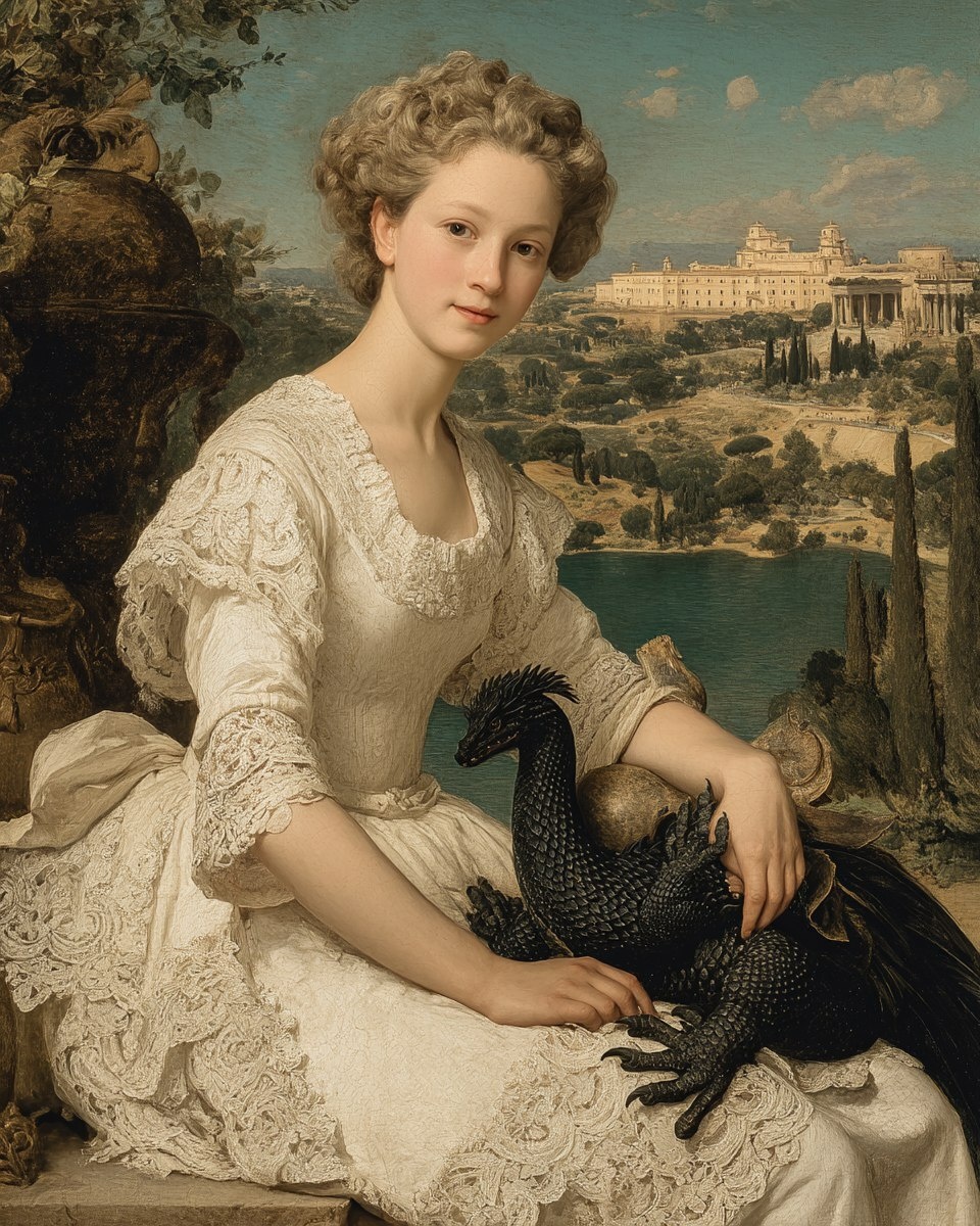 Создано на основе запроса: portrait of a woman in white lace dress, holding a big shining dark blue dragon, landscape of lake, blue sky, cypress trees afar, a florentine castle, extremely sharp intricate details in the face and dress, high resolution , oil painting in the style of Nicolas Poussin --- Автоперевод: Портрет женщины в белом кружевном платье, держащем большой сияющий темно -синий дракон, пейзаж озера, голубое небо, кипарисовые деревья издалека, флорентийский замок, чрезвычайно острые детали в лице и платье, высокое разрешение, масляная живопись в стиле Николаса Пуссин Как тебе эта генерация? 🤔 https://dzen.ru/id/65c0c65c86e4f837c27b24d7 #ИИ #AI #нейросеть #midjourney #art