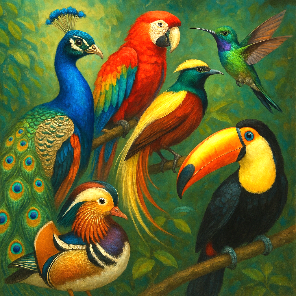 Павли́н — король красоты среди птиц. Его огромный разноцветный хвост с «глазами» завораживает. Ара (попугай) — яркие цвета, грациозность и интеллект. Райская птица — их перья и танцы — настоящее шоу природы. Колибри — маленькая, но с переливающимися, как драгоценности, перышками. Мандаринка (утка) — особенно самец: выглядит как произведение искусства. Тукан — огромный яркий клюв и стильный черно-белый «костюм».