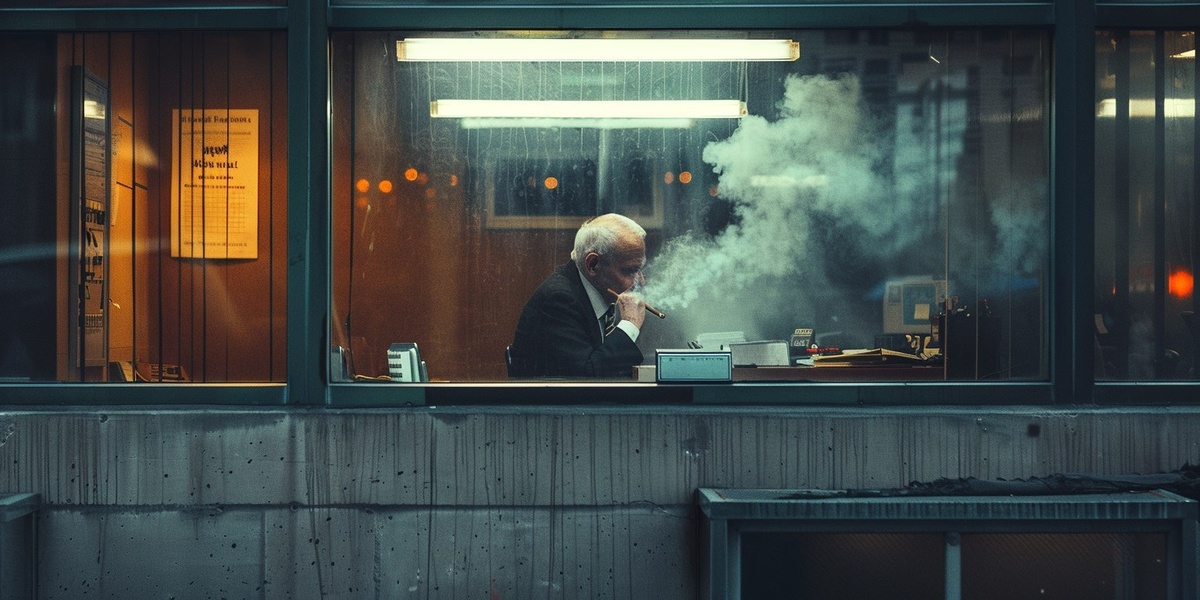 Создано на основе запроса: a brightly lit photograph standing outside looking into an office window at an old white man behind an office desk smoking a cigar. The building is concrete. --- Автоперевод: Ярко освещенная фотография, стоящая на улице, заглядывающая в офисное окно у старого белого человека за офисным столом, курящим сигару. Какое твое мнение? 🤔 https://dzen.ru/id/65c0c65c86e4f837c27b24d7 #ИИ #AI #нейросеть #midjourney #art