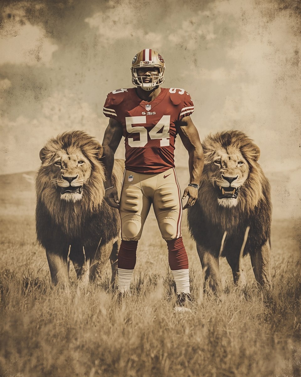 Создано на основе запроса: Fred Warner of the San Francisco 49ers with jersey number 54 is accompanied by two impressive lions