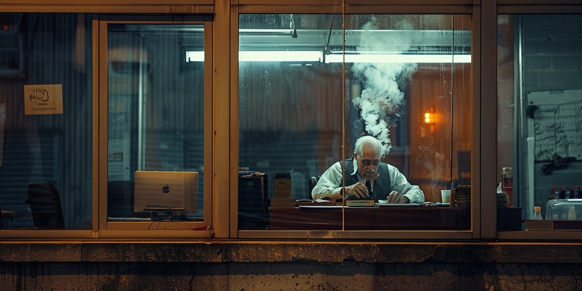 Создано на основе запроса: a brightly lit photograph standing outside looking into an office window at an old white man behind an office