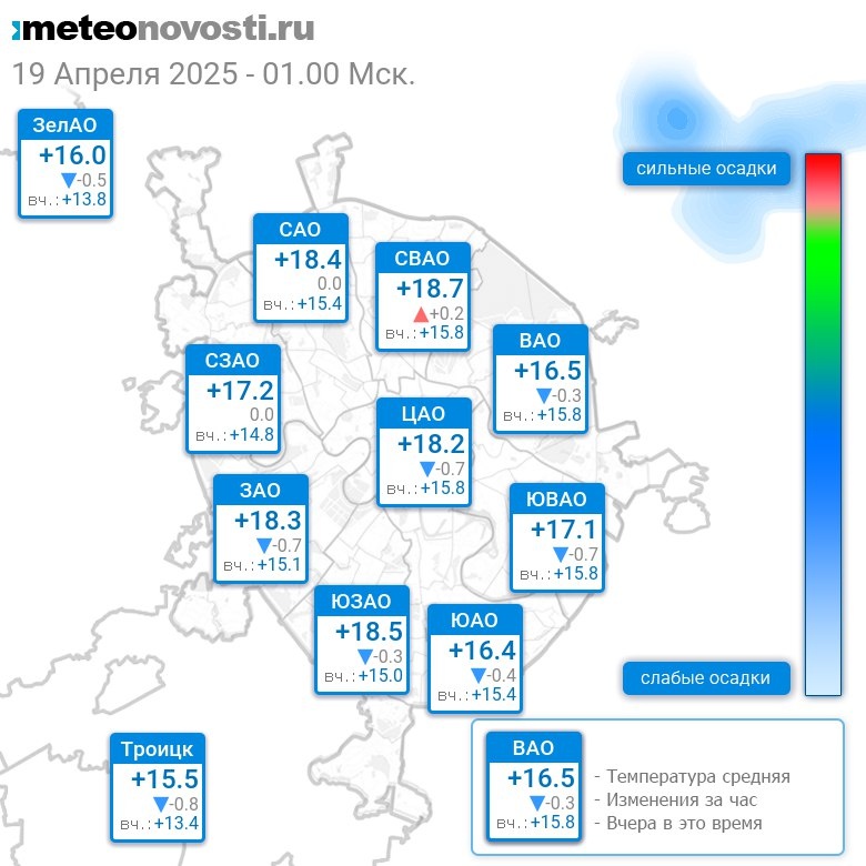 В 1:00 в Москве было от +14.6°C до +19.2°C, средняя температура +17.6°C #погода #Москва #весна #температура #19апреля #суббота
